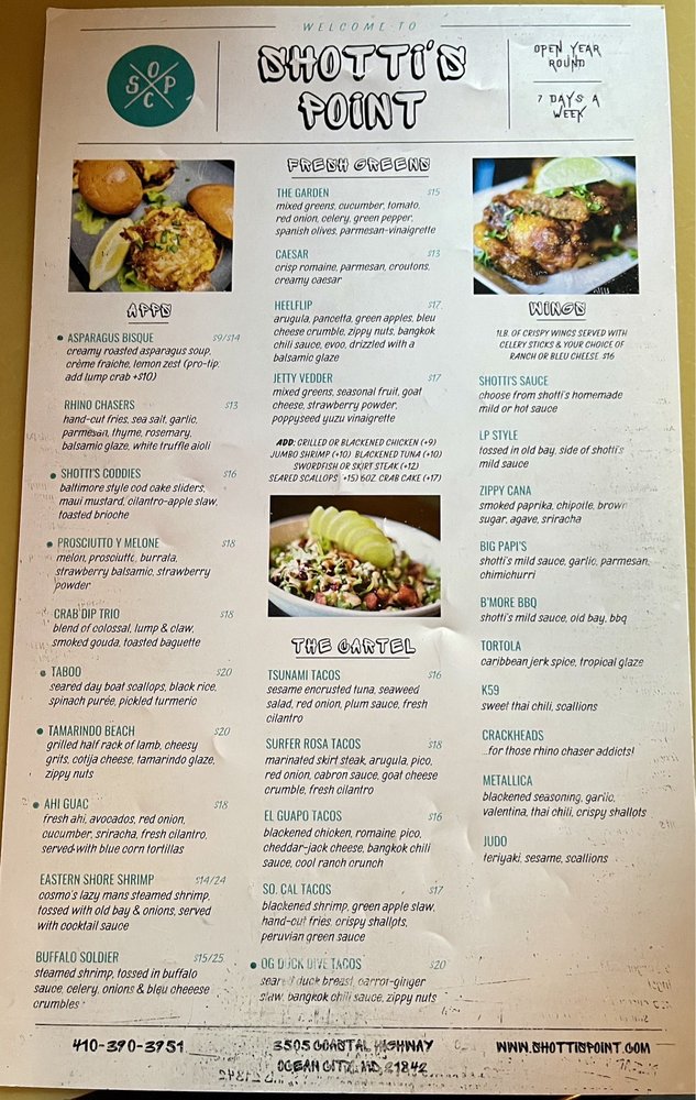 Introducing Shotti's Point - Ocean City, a trendy and casual dining spot located at 3505 Coastal Hwy in Ocean City, MD. This women-owned establishment offers a diverse menu featuring pizza, seafood, and tacos with many vegetarian options. Customers praise the friendly staff, great food, and drink selection. Highlights include their nightly specials such as the $10 two-topping coal-fired pizza on Wednesdays. The atmosphere is lively with happy hour specials, outdoor seating, and surf videos playing at the bar. Standout dishes like the EA Poe burger, buffalo wings with Shotti sauce, and shrimp/crab/scallop burrito have received rave reviews. With excellent service, reasonable prices, and a vibrant ambiance, Shotti's Point is a must-visit for locals and visitors alike.